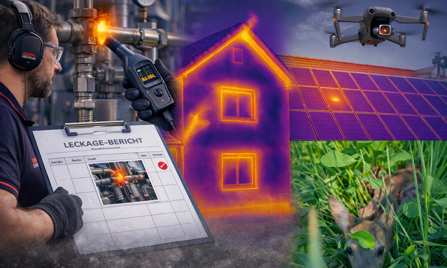Ergänzend kommen Wärmebildtechnik und Drohnenthermografie zum Einsatz, um Wärmeverluste an Gebäuden, Feuchtigkeitsschäden, Defekte an Photovoltaikanlagen sowie thermische Auffälligkeiten an technischen Anlagen frühzeitig zu erkennen.